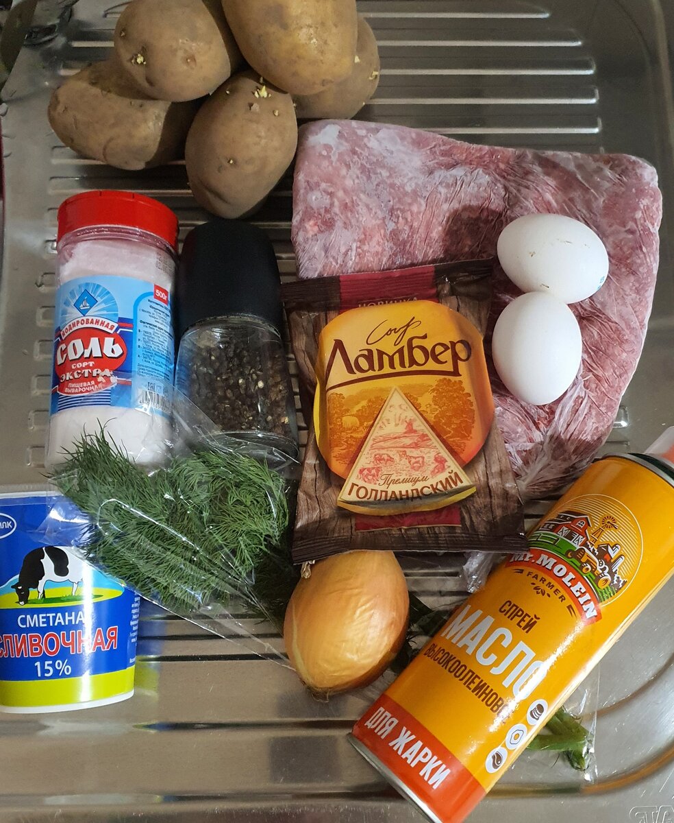 Очень вкусное и сытное блюдо на каждый день. Готовится она очень просто и достаточно быстро. Получается что-то вроде большого сытного драника с мясом. Ингредиенты: - картофель 1 килограмм - фарш мясной 300 грамм - яйцо куриное 2 штуки - лук репчатый 1 штука - сметана 2 столовые ложки - твердый сыр 200 грамм - соль, черный молотый перец и зелень по вкусу Лук измельчаем в блендере до состояния кашицы или трем на мелкой терке. Зелень моем, сушим и мелко нарезаем. На мелкой терке натереть сыр. К фаршу добавить зелень, соль, перец. Тщательно перемешайте. Картофель очистите от кожуры. Натрите в глубокую миску картофель на крупной тёрке, жидкость которая образуется - слейте. Добавьте в картофель сметану, яйца, 150 грамм сыра, перец и соль по вкусу. Тщательно перемешайте. Форму для запекания смажьте растительным маслом и выложите половину картофельно-сырной массы, распределите равномерно по дну формы. Фарш выложите равномерно поверх слоя с картофелем. Вторую часть картофельно-сы