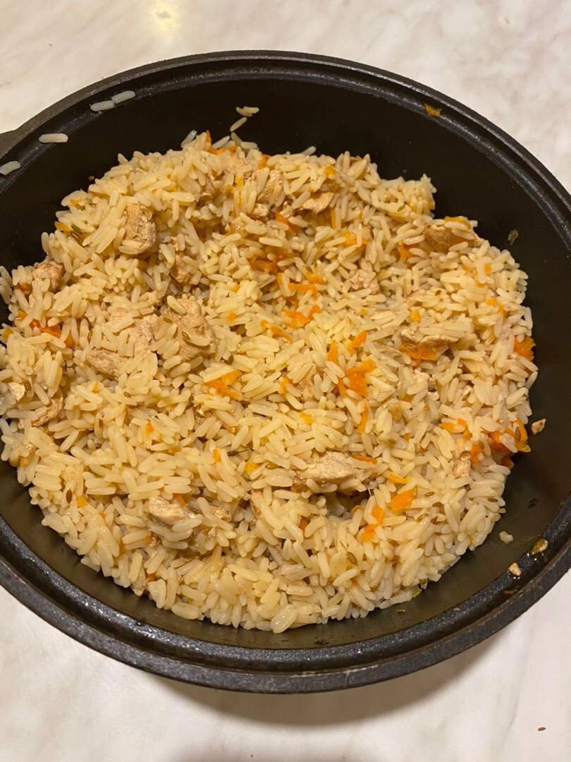 Ингредиенты: Риса, Куриная грудка , Морковь, Репчатый лук, Чеснок, Соль , Семена кумина (зира) Способ приготовления: Рис промываем, заливаем кипятком на 5 минут, затем сливаем воду. Морковь трём на крупной терке. Курицу нарезаем небольшими кусочками. Лук нарезаем полукольцами. Наливаем масло в казан. Когда масло нагреется, выкладываем лук и жарим до темно-коричневого цвета на медленном огне, но не до углей. Добавляем курицу, солим, перемешиваем и жарим 10 минут на среднем огне. Добавляем морковь, но не перемешиваем, накрываем крышкой и тушим минут 5-7. В рис добавляем зерна зиры (кумина) и перемешиваем. В кастрюлю выкладываем рис и добавляем 3 стакана подсоленной воды. Уровень воды должен быть на 1 см выше риса. Варим в течение минут 15 на медленном огне. Затем открываем крышку, делаем небольшие отверстия и выкладываем в отверстия чеснок. Перемешивать не нужно. Тушим плов еще минут 10 на медленном огне. Чтобы проверить, готов ли рис, аккуратно лопаткой снимаем верхний слой риса и перев