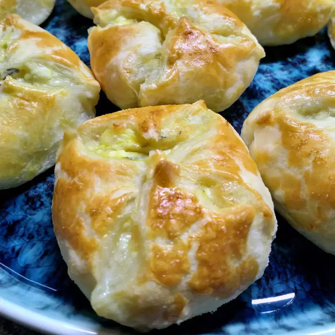 Ингредиенты: Слоеное тесто , Творог , Сулугуни , Петрушка , Яйцо , Хмели сунели Способ приготовления: Насыпать в миску творог, натертый на крупной тёрке сулугуни, нарезанную петрушку, 1 яйцо, хмели сунели и хорошо перемешать. Разморозить тесто. Раскатать. Нарезать квадраты. В середину каждого квадрата выложить начинку и защипать края формируя булочки. Заготовки смазать взбитым яйцом. Запекать в разогретой до 180 градусов духовке 30-35 минут Приятного аппетита!
