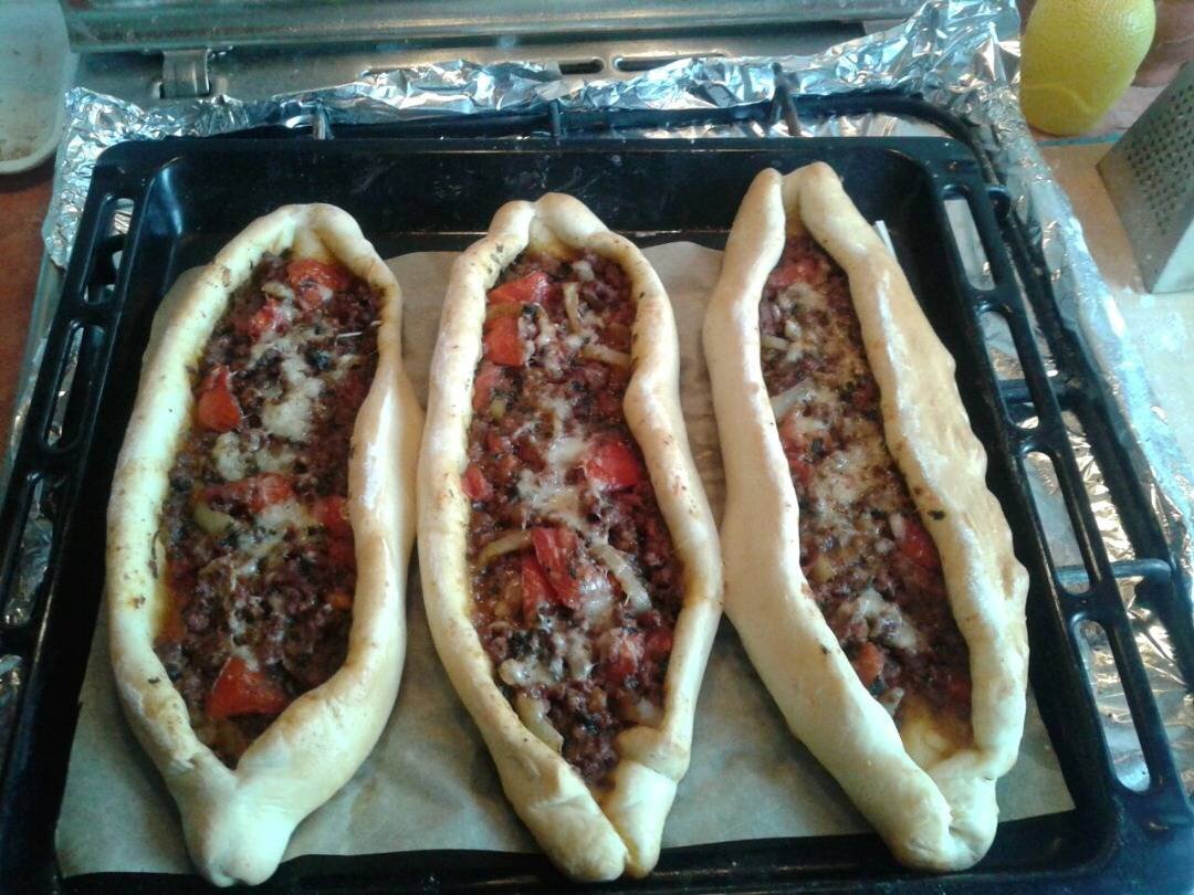 Страва яку обожнює моя родина, "турецька піцца" яка містить лише корисні інгредієнти. Ингредиенты: теплої води, теплого молока, яйце, борошна, дріжджів, солі, цукру, олії, яловичого фаршу, зелених солодких перця, цибулини, петрушки, томатної пасти, великий помідор, Суміш перців, твердого сиру Способ приготовления: Приготувати дріжжове тісто з інгредієнтів для тіста: в теплу воду з молоком додати сіль, цукор, борошно, яйце, олію. (детальну технологію тіста можна подивитися в моїх інших рецептах, де детально описувала весь процес). Дати піднятися. Поки тісто підходить готуємо начинку: напательні обсмажуємо нарізану цибулю, додаємо яловичій фарш, і нарізаний перець, 1 ч. л томатної пасти і нарізаний помідор. Обсмажуємо до напівготовності солимо, додаємо спеції за смаком та нарізану зелень петрушки. Тісто, яке підійшло слід обім'ямти розділити на 6 частин. Кожну частину розкачати качалкою товщиною 7-8 мм в овальний пласт. Перенести розкачане тісто на вислане пергаментом деко, сформувати чо