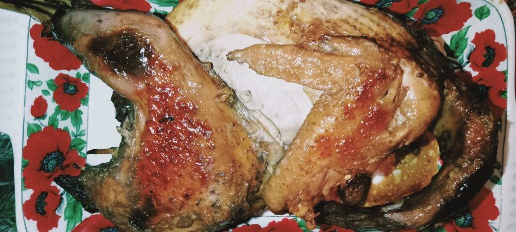 #кукпад4 Дорогие кукпадовцы поздравляю вас с праздником! Желаю готовить с любовью и вдохновением! Пусть процесс приготовления всегда будет творческим и интересным! Ингредиенты: тушка цесарки, гранатовый соус, Соль , яблоки, мандарин, майонез Способ приготовления: Мясо обмыть, дать стечь воде, натереть хорошенько солью. Яблоки помыть, крупно порезать, изъяв сердцевину с семечками, мандарин почистить, разделить на дольки. Фрукты облить гранатовым соусом. Начинить цесарку фруктами, закрепить зубочистками. Майонез смешать с гранатовым соусом, натереть цесарку сверху. Оставить на 1 час мариноваться. Поставить в разогретую духовку на 190 градусов, в рукаве или пакете для запекания, сделав небольшие дырочки в нем. Готовить 1 час. Приятного аппетита!