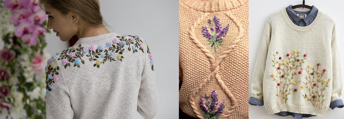 В прошлой статье я рассказала о том, что не понравилось дочери в жилетке, которую я ей связала. И, я решила написать статью про то, как вещи могут стать нескучными. У вязаных вручную вещей есть неоспоримое преимущество - они уникальны, не бывает двух совершенно одинаковых вещей! Кроме того, можно сделать совершенно уникальный неповторимый декор! Использовать можно любые материалы, оставшиеся от рукоделия : цветные пуговицы, ленточки, тесемки, бусины, бисер, паетки, цветные нитки. Все зависит от фантазии и желания. Вышивка Вышивка на вязанных вещах может обновить изделие или сделать его ярче, добавить изюминку. Есть множество способов вышивки на трикотажном полотне – гладью, лентами, крестом, в стиле «рококо». Важно: Вышивка на вязанных изделиях делается после влажно-тепловой обработки, особенно если это новая вещь. Петли изделия становятся ровными, изделие приобретает свою конечную форму. Если сделать узор на неподготовленном полотне, после первой стирки он деформируется. Особенно ин