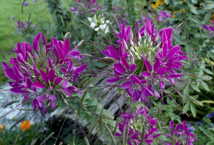 У этого растения чрезвычайно интересные цветки, за что оно получило название "цветок-паук", при этом цветение, похожее на брызги шампанского, продолжается все лето.