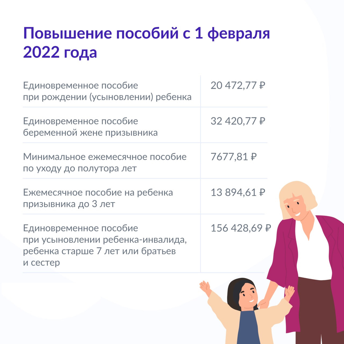 📈 Повышение некоторых пособий происходит ежегодно с 1 февраля. В этом году индексация составит 8,4%. В таблице — новые суммы выплат. Кроме детских пособий также вырастет пособие на погребение, выплаты участникам ВОВ, Героям труда, инвалидам из-за чернобыльской катастрофы или войны, а также на содержание собак-проводников.