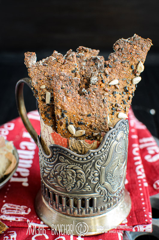 Здравствуйте дорогие читатели и подписчики канала: «Галина А.»! Обожаю иметь запас таких хлебцев! Раз напек гору, отправил в контейнер, и доставай себе потихоньку… Эти ржаные хлебцы получаются очень хрустящими, а еще — очень сытными благодаря тому, что они на треть состоят из семечек-орешков. И вкусно неописуемо! Впервые подобные хрустяшки с кучей зернышек я приготовила по рецепту с сайта Хлебомолы, и так их полюбила, что теперь готовлю время от времени. Делаю большой запек, и запаса хватает надолго. Это удобно, согласитесь! Приятность в том, что готовить их очень просто. По сути вам нужно просто все смешать, раскатать и испечь. А бонус в том, что я иногда утилизирую таким образом остатки своей закваски. Со временем, когда рецепт используешь регулярно, подстраиваешь его под себя. Что особенного в том рецепте, которым я пользуюсь сейчас и регулярно? Во-первых, мне удобен расчет на 1 кг муки (ну или пересчет на закваску — тоже удобно считать). Во-вторых, рецепт вариативен: мука (получает
