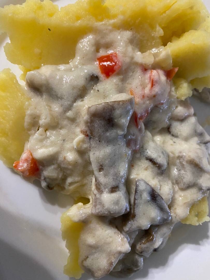 Ингредиенты: белые сушёные грибы, луковица, соль, перец, сметаны, воды, муки, вегета приправа, болгарский перец по желанию Способ приготовления: Грибы предварительно замочим в воде, как они стали мягкие, промываем и кладём в кастрюлю, доводим до кипения, как закипело выливаем на дуршлаг и промываем, кладём в кастрюлю и наливаем воду, варим 40 минут. Лук режем мелко и обжариваем в небольшом количестве масла, по желанию добавить болгарский перец, обжариваем и добавляем муку, хорошо перемешиваем и наливаем воду, кладём сметану и специи, добавляем грибы и тушим 5 минут, накрываем крышкой и готово!