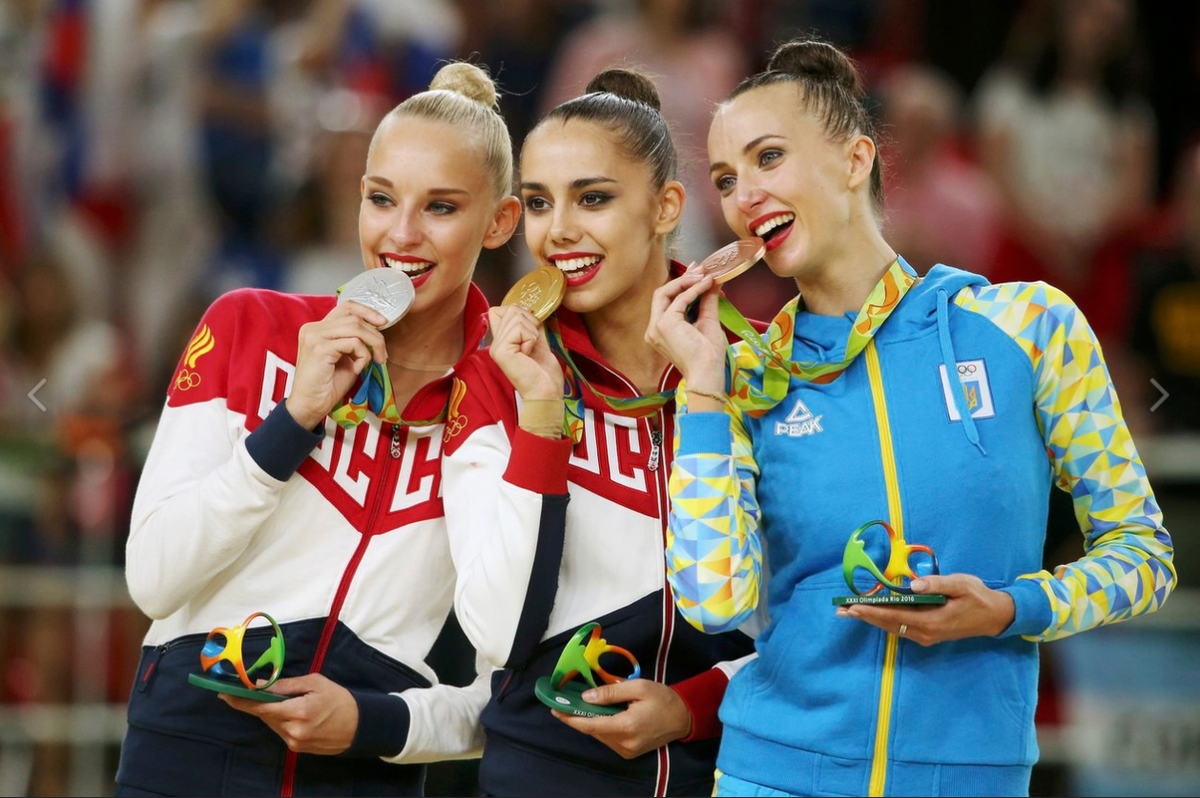 Рио 2016. Призеры олимпийского турнира по художественной гимнастике в личном многоборье: Яна Кудрявцева (серебро), Маргарита Мамун (золото) (обе - Россия), Анна Ризатдинова (бронза) (Украина). Олимпийские игры в Мельбурне 1956 год. Олимпийские чемпионы — мужская команда СССР по гимнастике (слева направо: Юрий Титов, Альберт Азарян, Павел Столбов, Валентин Муратов, Борис Шахлин, Виктор Чукарин). Лондон 2012. Призёры в стрельбе из пневматической винтовки на 10 м у женщин: серебро - Сильвия Богачка (Польша), золото - Ю Си Линг (Китай), бронза - Ю Дань (Китай)