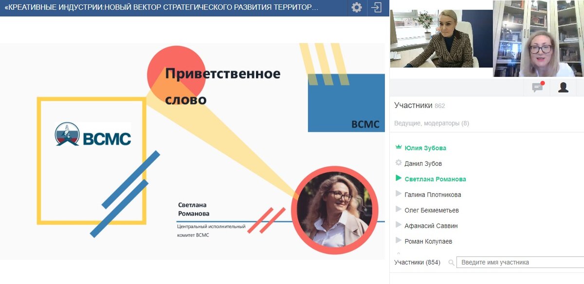 Всероссийский Совет местного самоуправления совместно с Академией городских технологий «SREDA» 18 января 2022 г. провел методический вебинар «Креативные индустрии: новый вектор стратегического развития территорий» Всероссийский Совет местного самоуправлениясовместно с Академией городских технологий «SREDA» 18 января 2022 г. провел методический вебинар «Креативные индустрии: новый вектор стратегического развития территорий». Заместитель Председателя Центрального Совета – Руководитель Центрального исполнительного комитета ВСМС Светлана Романова обратилась ко всем участникам и выступающим с приветственным словом. «От имени Председателя Всероссийского Совета местного самоуправления Олега Владимировича Мельниченко и от себя лично рада приветствовать участников вебинара «Креативные индустрии: новый вектор стратегического развитиятерриторий». В условиях современных вызовов креативные индустрии стали одной из самых популярных тем для обсуждения. И не случайно. Мировая практика показывает, чт