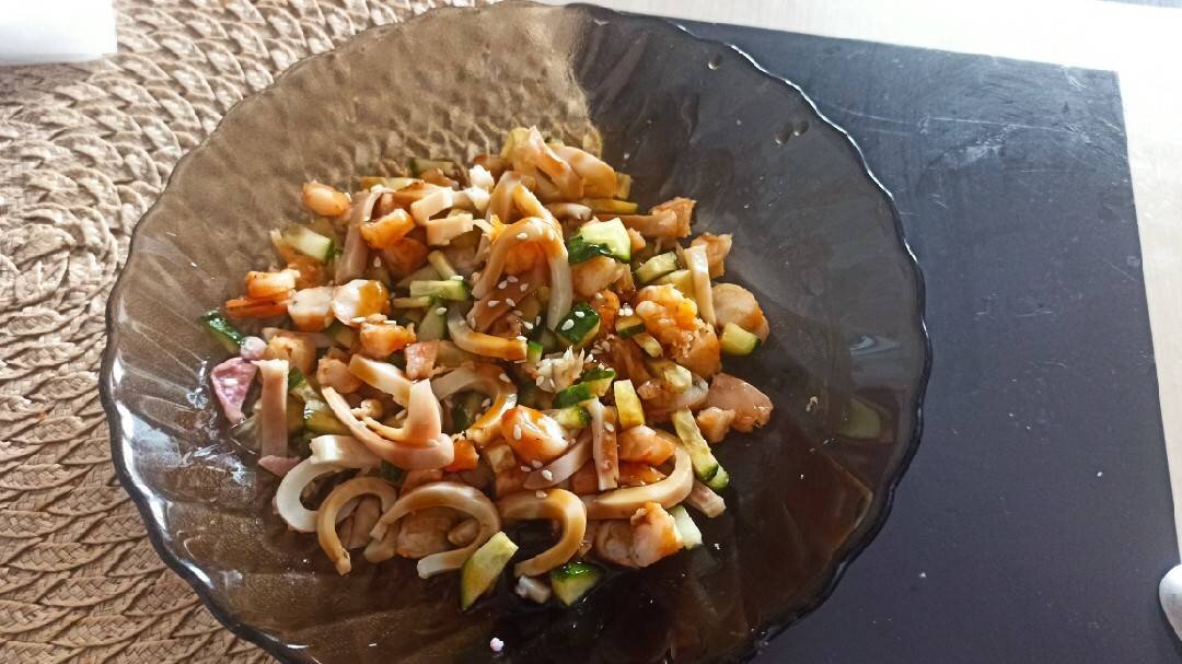 #кукпад4 Ингредиенты: Кальмар, Креветки, Огурец, Соус терияки, Кунжут Способ приготовления: Ставим кипятиться воду. Кальмар промываем, очищаем от всего лишнего и опять промываем. Как вода закипит кладём в воду кальмар и варим 5 минут. Креветки жареные очищаем и режем произвольно. Огурец нарезаем сначала пластинками, потом соломкой. Добавляем в тарелку все ингредиенты. Добавляем по вкусу соус терияки. Перемешиваем и посылаем немного кунжутом. Приятного аппетита 🤗