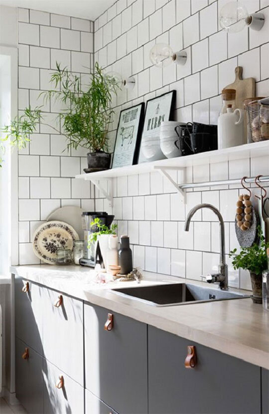 Прежде всего фасады и стены должны иметь светлые тона. Не следует думать, что белый цвет маркий, для кухни такое определение не подходит, особенно в том случае, когда кухня имеет мало квадратных метров. Даже если на белом фоне появится загрязнение, то вы его сразу увидите и уберете. Также на темных поверхностях пыль видна более отчетливо, чем на светлых. Не загромождайте пространство шкафами, это утяжеляет обстановку. Лучше купить полочки, на которых можно разместить посуду, фотографии и вазы. Такое решение для маленьких кухонь будет правильным эстетически. Но если все-таки делаете подвесные шкафы - делайте их прямо под потолок! Также правильным будет для небольших кухонь выбор раскладной мебели. При необходимости складные стулья можно собрать и вынести, например, на балк
