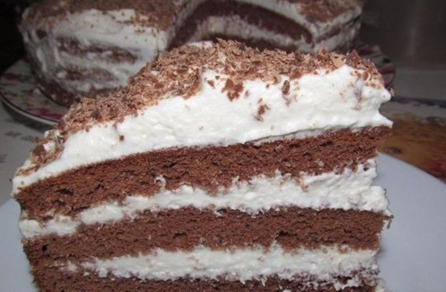 2.В посуду с сухой смесью влить взбитые яйца, хорошо перемешать. Вылить в смазанную маслом форму, поместить в разогретую духовку. Выпекать 50 минут при температуре 200-170 градусов. Охлаждённый пирог разрезать вдоль на 3 части, перемазать кремом, сверху посыпать шоколадом или орехами.
