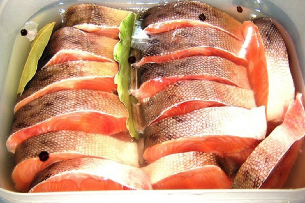 2. Мокрым. Для этого используются маринады, соки, рассолы. Кусочки рыбы погружают в холодную заливку и ждут готовности.