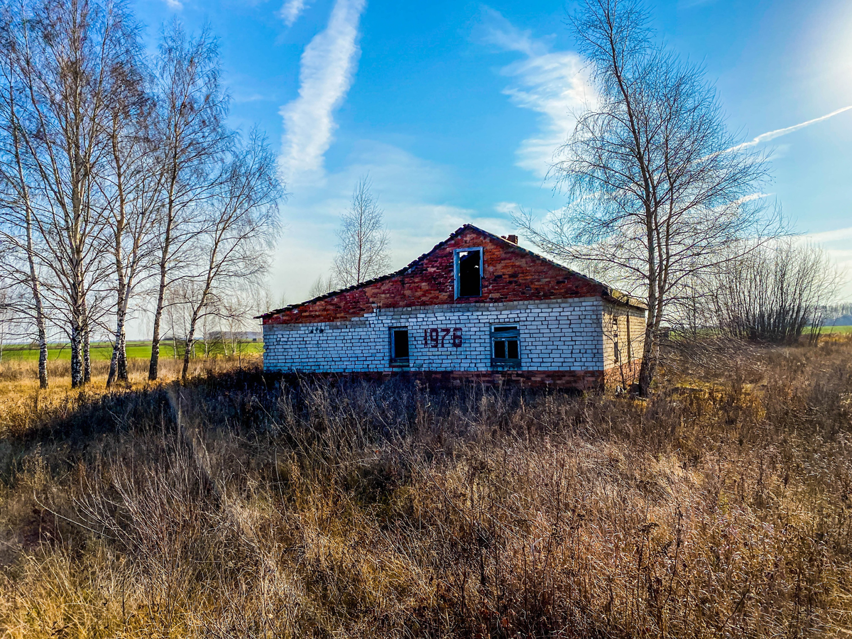 Этой осенью мы с другом ездили в небольшое путешествие по Рязанской области. И вот, где то там, в самой глубинке Рязанщины, проезжая по дороге, мы заприметили чуть вдалеке какое-то строение. Причём никаких населённых пунктов поблизости не было. Просто одинокое здание стоит в поле, а рядом с ней растут несколько деревьев. И все. И, судя по всему, здание это было заброшено. К нему даже и дороги никакой уже не было. Все заросло травой. Мы решили оставить машину у трассы, и дойти до этой заброшки. Осмотреть ее внутри. Пришлось нам немного пройти по сильно пересечённой местности, изрытой какими-то канавами, и вот мы уже стояли возле того строения. Оно было построено из силикатного кирпича, а в кладке красным кирпичом был выложен год постройки - 1976. Крыша у здания вроде бы сохранилась, а вот вместо окон зияли лишь пустые проёмы. Двери у строения, скорее всего, тоже нет. Так что, нам, возможно, и удастся попасть внутрь. Рядом с заброшкой в два ряда было посажено шесть берёз, а между ними с