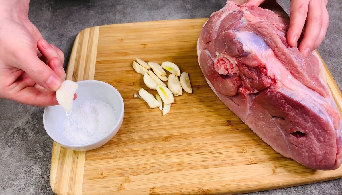 1. С помощью ножа делаем глубокие надрезы по всей поверхности рульки.
