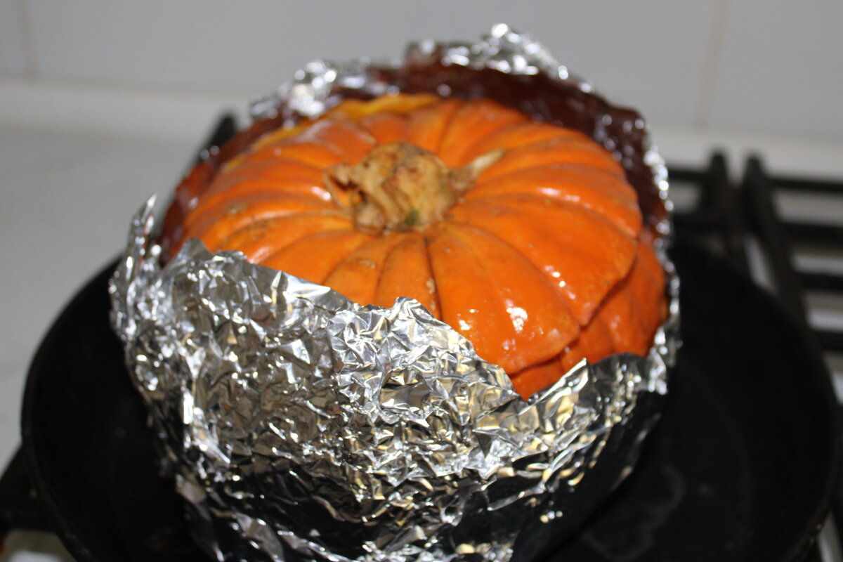 Добрый день, уважаемый читатель!!! У меня оставалась последеяя осенняя маленькая тыква и я решила её использовать. Приготовила очень вкусное блюдо. Гречневую кашу с мясом и черносливом в тыквенном горшочке. Для начала срезала будущую крышку и почистила тыкву от семечек. В качестве начтнки у меня была свинина, обжарила её с луком и специями. Просто обжарила, доготовится уже в духовке. Саму тыкву внутри смазала маслом, солью и специями. Укладываем мясо, чернослив и гречку. У меня ушло 0.5 стакана гречки. Зависит от объема тыквы. Солим, посыпаем специями и добавляем воду. Объем воды зависит от объема крупы 2:1. У меня ушёл 1 стакан. Закрываем тыквенной крышкой, оборачиваем хорошо в фольгу. В духовку на 200С. У меня запекалось все 2 часа. Если тыква большая, то время может увеличиться. Блюдо готово когда тыква станет мягкой, а внутри сварится крупа. Снимаем крышку.... Подавать можно как на фото ниже Но вкуснее всего перемешать мякоть тыквы с начинкой в самом горшочке. Тогда все ароматы п