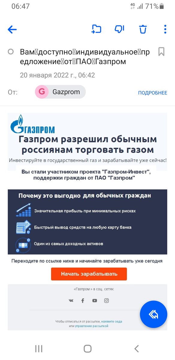Помните об этом друзья, когда получаете различные "заманчивые" предложения по почте. Вот сегодня получил письмо аж от самого ГАЗПРОМА! Согласитесь, кто ж устоит, когда ему пишет само "национальное достояние"? Предлагают прям замечательные вещи, дескать ГАЗПРОМ разрешил торговать газом))) Прям вижу, как баба Валя на базаре "заместо" семечек - газом торгует))) Нажимаем на "подробнее" рядом с адресом корреспондента Gazprom. И что мы видим? Обычный адрес, обычной почты mail.ru! А на фото, два черта бизнесмена в дешевых шмотках и китайских очках. Один со стаканом пива, а второй видимо накануне перебрал: морда опухшая, а на столе кофеек. Относитесь внимательнее ко всяким подобным "инвестидеям", которыми сейчас буквально заваливают мошенники всех мастей! А самое главное, предупредите ваших родственников, особенно пожилых, которые ведутся на всякие громкие имена и бренды (кто ж не знает Газпром то?). На этом у меня все. Подписывайтесь на канал, ставьте лайки и пишите комментарии. Всем удачи и