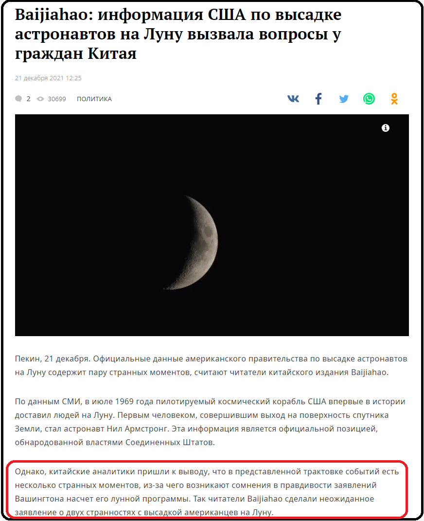 1. "китайские аналитики пришли к выводу, что в представленной трактовке событий есть несколько странных моментов, из-за чего возникают сомнения в правдивости заявлений Вашингтона насчет его лунной программы. Так читатели Baijiahao сделали неожиданное заявление о двух странностях с высадкой американцев на Луну."