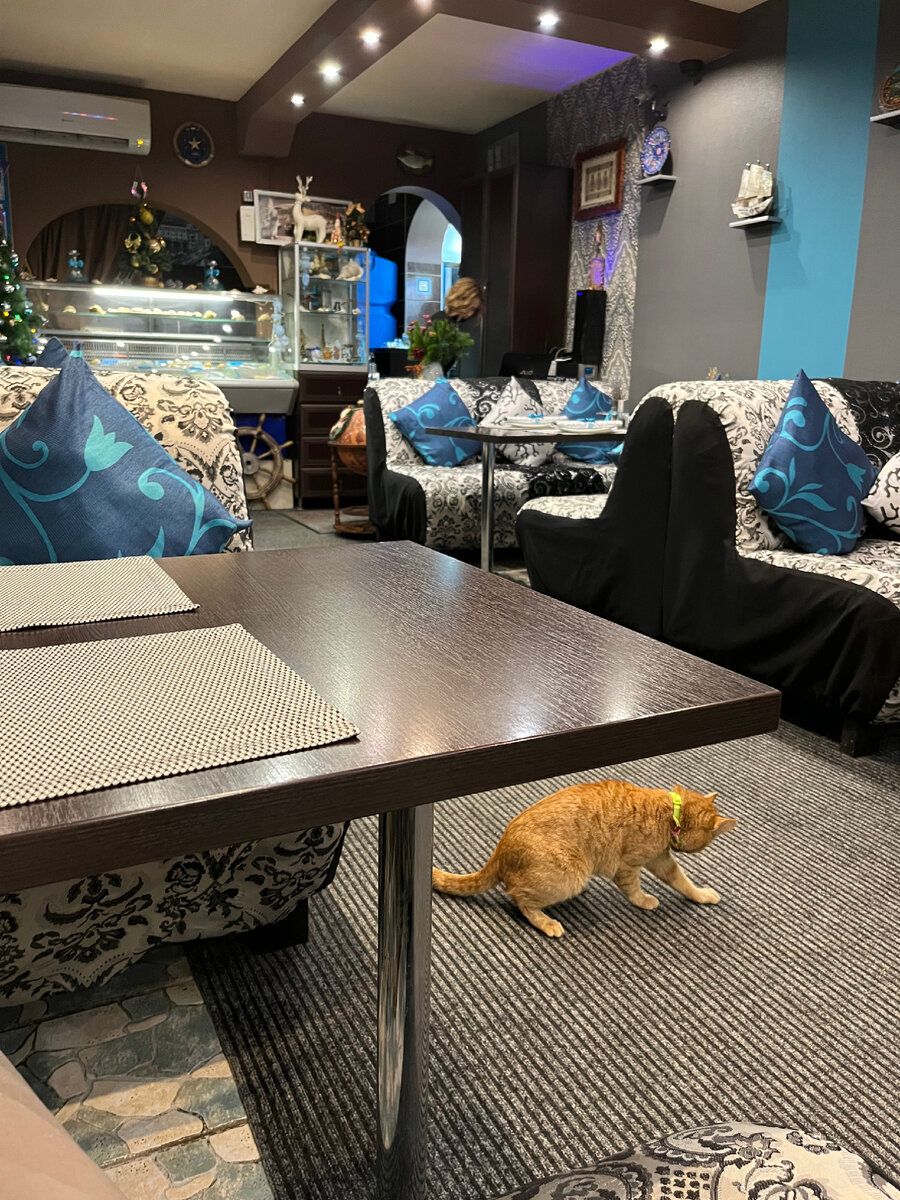Именные кафе и рестораны, это как эхо 90-х. Обычно такие места обходятся стороной. Но рекомендации знакомых и интерес перевесили. Тем более уклон на свежую рыбу! Находится недалеко от центра, подвальное помещение. Дизайн - гостеприимная Турция. Полная ресторанная сервировка, домашний котик, официант в меховых сапогах. Пазл концепции вообще разваливается. Но мы за едой. нам рекомендовали. Меню простое(без пицц и роллов, но с пастой) Есть рыбная витрина. Улов дня не всегда богат. Мы попали на барабульку и хамсу. Спиртное можно своё, бокалы любезно предоставят, за «пробку» денег не возьмут. Хлебная корзина в дар) Уха по-фински 290р хороший насыщенный сливками вкус. Лосось мелким кубиком, картофель наоборот очень крупным. Не эталон, но неплохо. Цезарь с лососем 280р для такой цены - салат отличный. Даже почти авторская подача. Приятно удивили что заморачиваются над этим. (На фото мы его уже развалили😂)Стараются. До Мишлена далеко, но в правильном направлении. Ну и собственно из-за