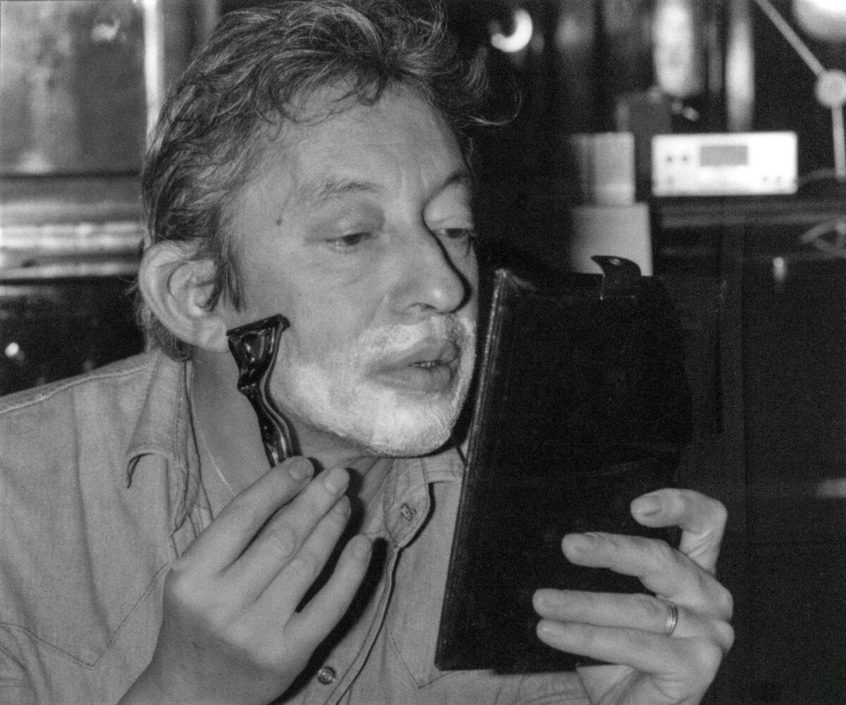 Серж Генсбур бреется. Серж - "известный французский поэт, композитор, автор и исполнитель песен, киноактёр, кинорежиссёр и киносценарист. Считается одной из самых важных фигур в мировой популярной музыке. Во Франции его творчество носит легендарный характер, и он является одним из самых почитаемых музыкантов" (Википедия). У нас он, в основном, известен как автор и исполнитель в дуэте с Джейн Биркин песни 1969 года "Je t’aime… moi non plus". Я услышал ее трансляцию из школьной радио-рубки в 1970. Одноклассницы краснели, мальчики делали вид, им по фиг. Все мы узнали, что у любви есть ритм. Но у французов. До Биркин, брак с которой длился 10 лет, у Сержа был роман с Бриджит Бардо. Уже будучи студентом ВУЗа я попросил франкоговорящего приятеля перевести мне текст. Он дослушал до конца и перевел: "О, Пьер!". Это правда. Сувенирный календарь 1909 года со слоганом "Брейся смолоду" и реклама "Gillette New Improved" (1921 - 1929) с гномами. Германские (?) бритвенные станки с абсолютно плоски