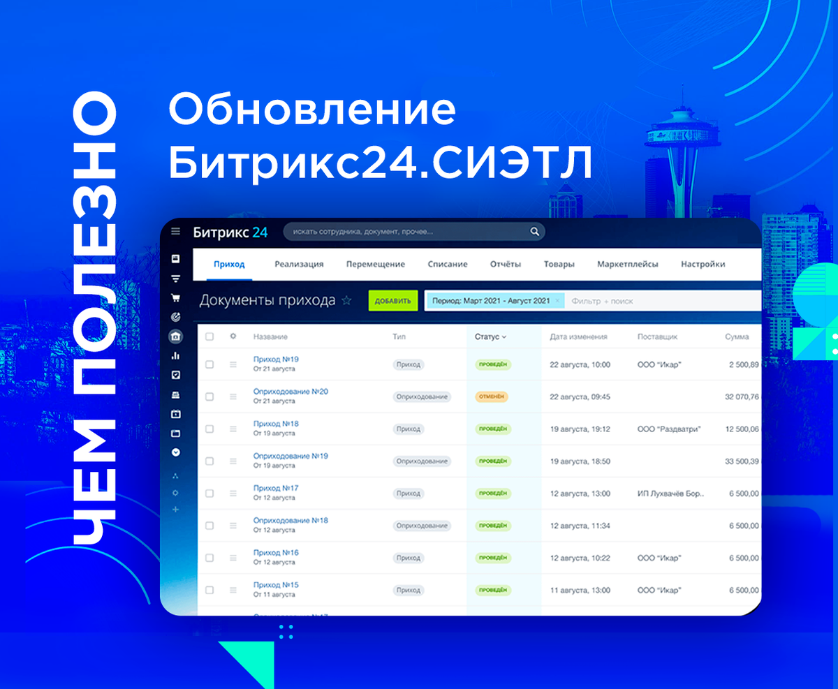 Битрикс24 позволяет управлять проектами и продажами с помощью различных инструментов. Компания регулярно выпускает обновления. В конце ноября 2021 года вышла версия СИЭТЛ. В конце ноября 2021 года вышла версия СИЭТЛ. Что нового появилось в обновлении Битрикс24.СИЭТЛ Какие новые продукты вышли с обновлением Битрикс24.СИЭТЛ Скрам Это методология работы с проектами, отлично подходит для продуктовых команд и даже команд любого бизнеса. Например, в функционале есть хранилище задач с возможностью выстраивания их в порядке важности и сложности, а также можно работать с задачами по спринтам – коротким периодам с конкретной целью выполнения. Складской учет Можно оприходовать товар даже через мобильное приложение, проводить резервирование, списание товаров, перемещение и т. д. Как воспользоваться Битрикс24 Если вы хотите внедрить Битрикс24 в своей организации, обращайтесь к нам. ГК «СофтЭксперт» – официальный и золотой партнер компании.