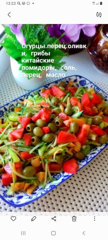 #закуска #салат Ингредиенты: грибы шампиньоны маринованные, огурцы свежие , перец сладкий красного и жёлтого цветов, помидоры , масло растительное , оливки Способ приготовления: Все ингредиенты режем, соединяем, добавляем грибы (грибы имеют свой соус). Перемешиваем. По желанию добавить зелень.