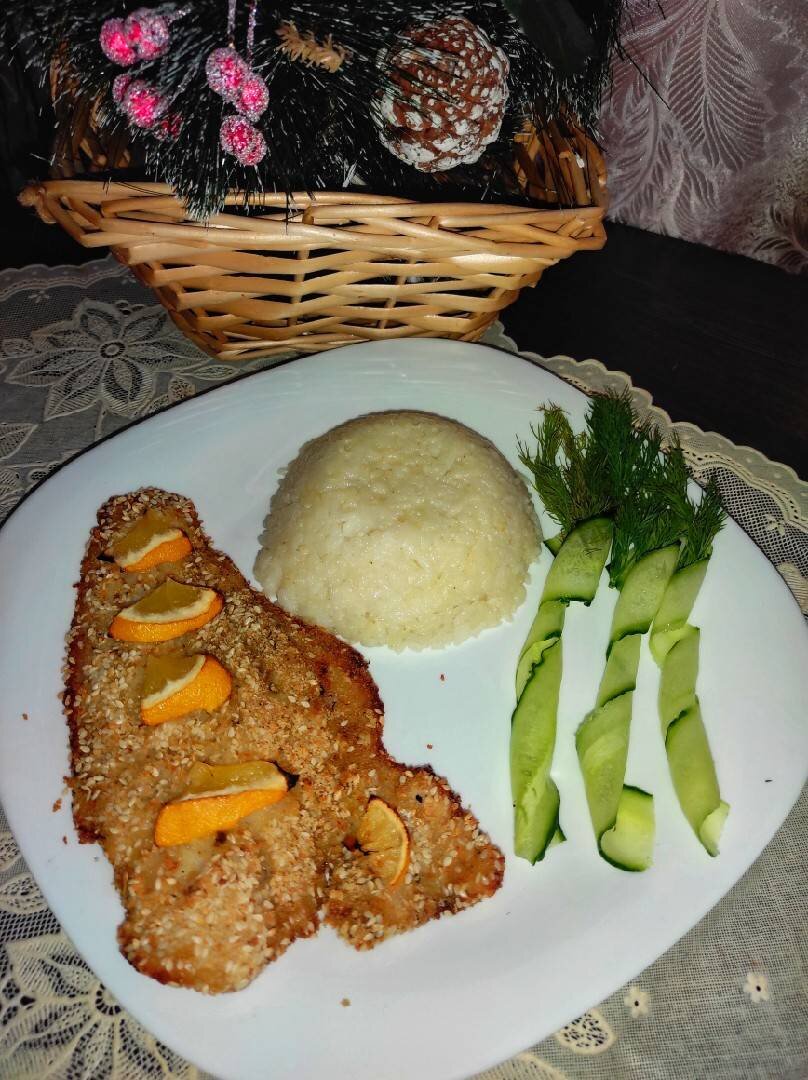 #кукпад4 #рыба #обед Ингредиенты: тушки морского языка, сушёной петрушки, лимон, соль , семян кунжута, молотых белых сухарей, белый молотый перец , любая рыбная приправа , растительное масло для смазывания противня, семена кунжута для посыпки готового блюда Способ приготовления: Морской язык разморозить, ополосните его холодной водой, воду слейте. Для маринада отрежьте половину лимона и выжмите весь сок в тарелку. Выжатый лимон не выбрасывайте, а порежьте на ломтики, они вам ещё пригодятся. В тарелку с соком положите сушёную петрушку, белый перец и приправу. Смесь перемешайте. Покройте маринадом рыбу и оставьте на 30 минут. Приготовьте панировку. Для этого насыпьте в ковшик кунжут и положите соль. Прокалите на огне до появления характерного орехового запаха. Остудите. Кунжут измельчите в блендере (я готовила целиком, мне больше так нравится) и соедините с молотыми сухарями. Перемешайте. Слегка смажьте противень маслом. Тушки морского языка разрежьте на две—три части, обваляйте в кунжут