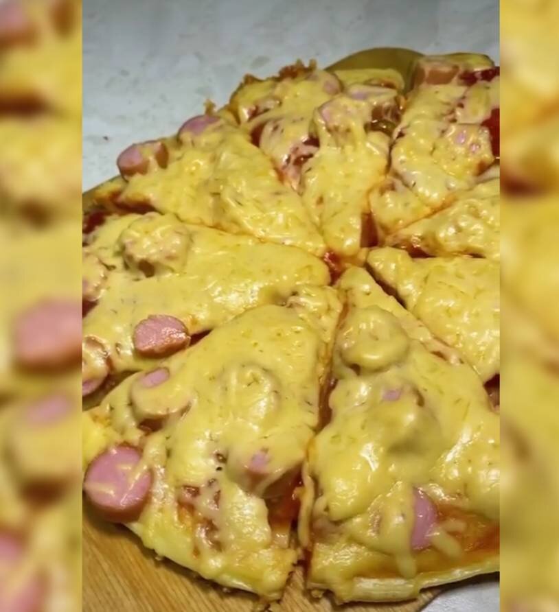 Ингредиенты: яйця, солі, кефіру або сметани, муки, Помідори, Ковбаски, Сир Способ приготовления: В миску вбиваємо 2 яйця Солимо та перемішуємо Додаємо вершки або сметану та перемішуємо Далі додаємо муку та перемішуємо Нарізаємо помідори, ковбаски та натираємо сир В сковорідку виливаємо тісто, додаємо кетчуп за смаком та перемішуємо Почергово викладаємо помідори, ковбаски та сир Готуємо до готовності з закритою кришкою. Смачного