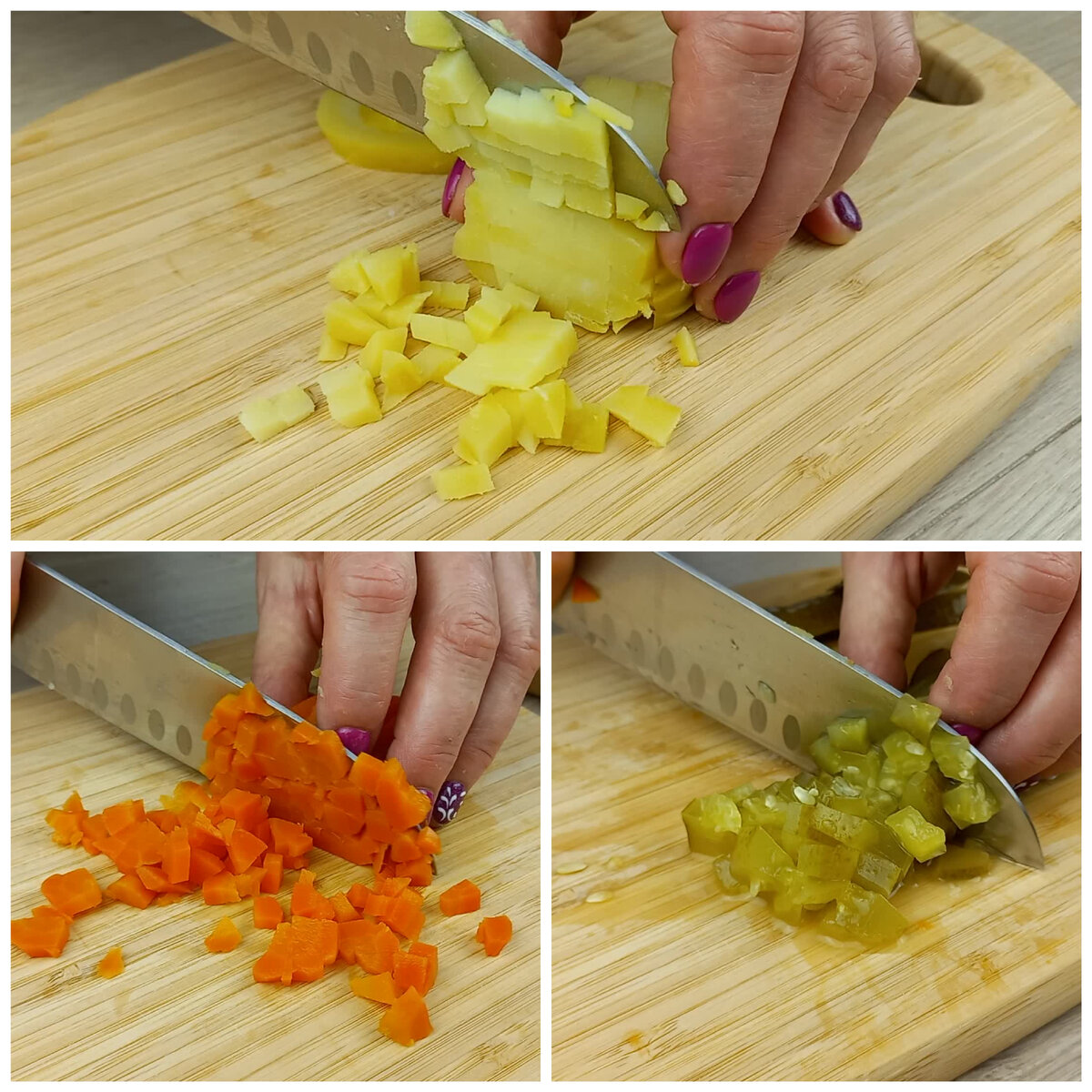 Здравствуйте, дорогие друзья! Когда организм требует витаминов, а душа ярких красок обязательно нужно приготовить винегрет. В нём вы найдёте и то, и другое. Много рецептов приготовления этого закусочного салата. Есть базовый вариант, в который входят такие ингредиенты как : морковь, картофель, свёкла, солёные огурцы, квашеная капуста, репчатый лук, растительное масло, при желании можно добавить уксус. Второй вариант назовём авторским. Вот с одним из таких вариантов я хочу Вас сегодня познакомить. Первоначально всё делаем по классическому рецепту - отварной картофель, отварную морковь и солёный огурец нарезаем на кубики. Такая нарезка очень хорошо смотрится в салате. Нарезанные овощи сбрасываем в миску. Добавляем квашеную капусту. Теперь к базовому рецепту начинаем добавлять консервированный зелёный горошек и консервированную кукурузу. Нарезаем зелёный лучок и отправляем его в миску. Шинкуем мелко репчатый лук и пассеруем его и выкладываем в миску. Нарезаем на кубики отварную свёклу.
