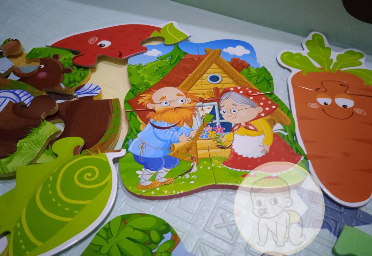 По нормам развития ребёнок с года до двух должен освоить пазлы, не большого количества элементов, но в любом случае навык необходимо приобрести. Для понимания сути нужно начать с картинок из 2-3-4 элементов. После освоения таких, можно покупать побольше. Первые такие пазлы нам подарили. Я совсем забыла о них и увидев, поняла, что нужно отправляться на поиски. Подаренные не плохие, но в них нет вариантов из двух деталей. Именно на двух деталях ребёнок начинает понимать принцип. Теперь у нас два вида. Расскажу о каждом из них. Набор посложнее сделан из вспененного полиэтилена. Они мягкие, ребёнок может их пожевать🙈. Но в этом их минус, потому что малышу необходимо приложить усилие, чтобы соединить детали. И если до этого он их измял, то соединяться они тоже будут с трудом. На мягкий материал сверху приклеена картинка. Она неплотная. Поэтому если пазл намочить, разорвать бумагу не так-то сложно, что у нас и произошло на одной из деталек. В качестве усложненного варианта пазлы с картинк