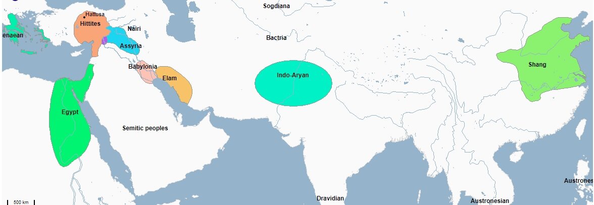 В Китае развивалось царство Шан, которому предстояло через несколько десятилетий подчинить себе другие китайские государства, и стать первым протоимперским гособразованием Китая. К 1300 году шаньцы переселились на реку Хуаньхэ, контролируя спуск по течению из лежащего западнее крупного аграрного района. Видимо, контроль крупного транспортного маршрута позволил шаньцам вскоре набраться сил и подчинить всех соседей. В 1311 году правителем становится Пань-Гэн, он развивал армию, сельское хозяйство, при нем появились новые ремёсла, например, шелководство. После его смерти, в 1290-х годах, правителем становится его брат Сяо-Синь, власть тогда передавалась братьям, а не сыновьям.