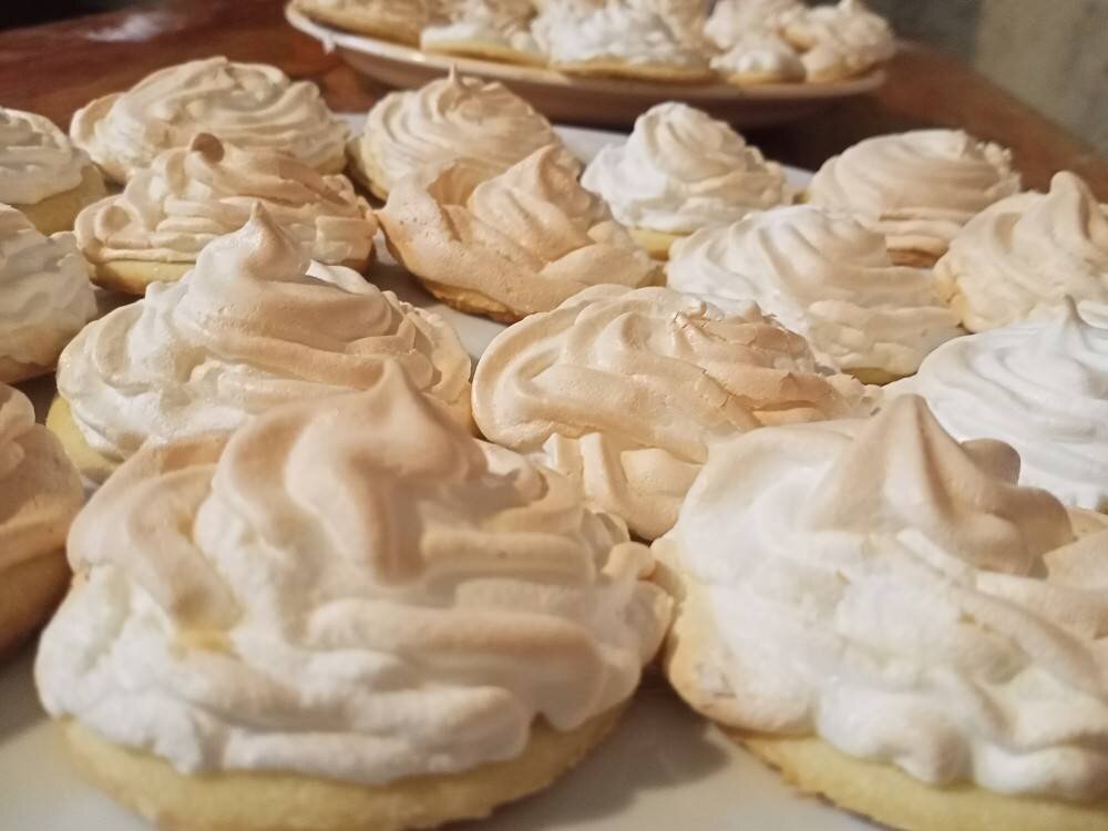 Ингредиенты: Тесто (ингредиенты на 50 шт), Сливочное масло, Желтки , Сахар, Соль , Начинка:, Белок , Сахар, Соль , Сок 1/3 лимона Способ приготовления: Для начала приготовим песочное тесто: в мягкое сливочное масло добавляем сахар и перетираем, добавляем желтки и смешиваем до однородной массы, добавляем муку и замешиваем мягкое, пластичное тесто, оно должно немного прилипать к рукам (это песочное тесто, его нельзя долго вымешивать так как оно не будет рассыпчатым) после того как тесто соберётся в один комок, его нужно положить в пакет, а затем в холодильник на 3-10 часов После того как тесто охладится делаем начинку, берём 1/3 теста, раскатываем 0,5-0,7 см, вырезаем кружки, выкладываем начинку (по желанию) это может быть фрукт, джем, варенье, мармелад и т.д. Теперь приготовим верхнюю часть, в охлаждённые белки добавляем соль и взбиваем до жёстких пиков, затем постепенно добавляем весь сахар, и взбиваем до твердых пиков) Белковую массу кладём в кондитерский мешок и насаживаем на тесто,