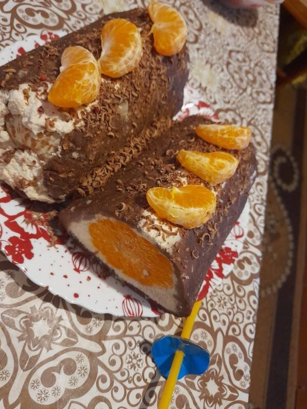 Ингредиенты: печенье , какао , бананы, творог , мед , мандарины Способ приготовления: Печенье измельчить с помощью блендера или мясорубки в мелкую крошку. Бананы измельчить тоже в блендере до состояние пюре. В глубокой миске смешать печенье, бананы и какао. К творогу добавьте мед и пробейте погружным блендером. На лист пергаментной бумаги выложите массу из печенья, раскатать тонко. Смажьте кремом из творога и выложите в ряд мандарины. Аккуратно сверните рулет и уберите в холодильник. Украсить по желанию.