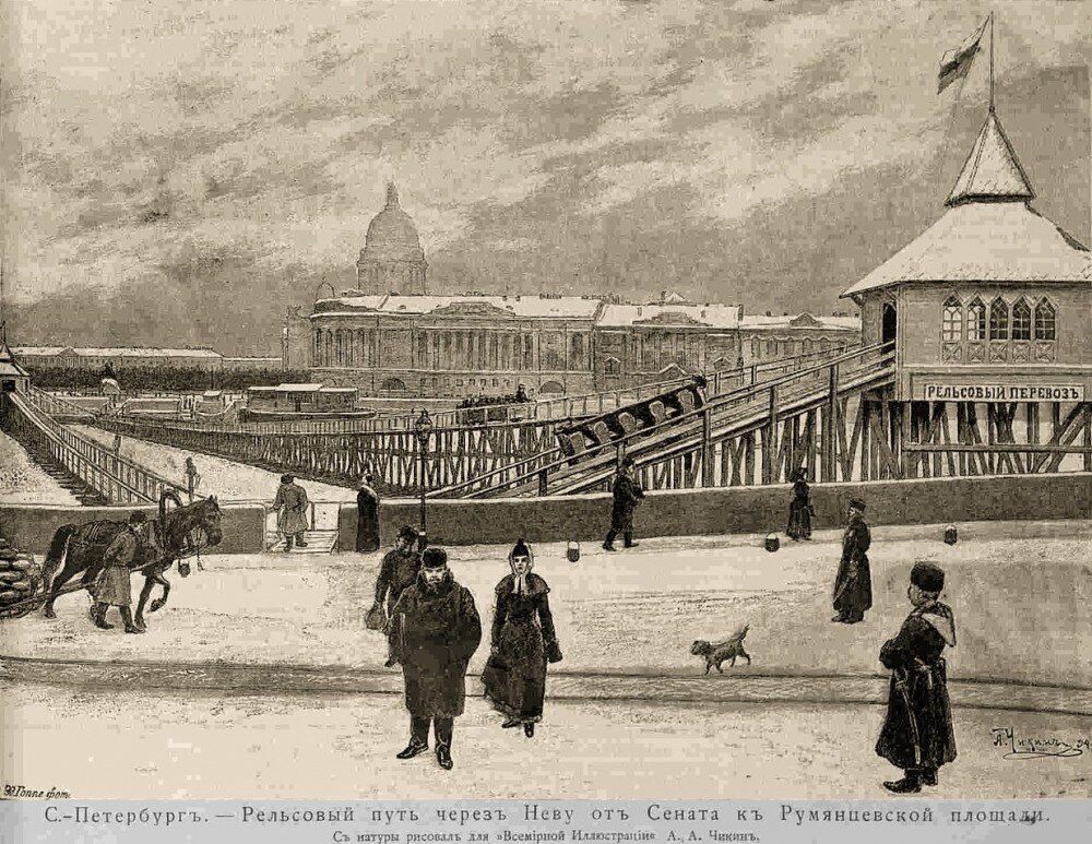 С середины XIX века главным видом общественного транспорта в столице была конка. Владельцы сети конно-железных дорог были хорошими бизнесменами и заранее получили у Думы монополию на все рельсовые перевозки. И когда в других российских городах уже вовсю ходили современные трамваи, в Петербурге по-прежнему передвигались на устаревшей конке. Тем не менее выход был найден. В 1894 году Финляндское общество лёгкого пароходства устроило так называемый рельсовый перекат через Неву. Это было остроумное решение: договорённости не нарушались, но город получал альтернативный вид транспорта. Озабоченные убытками владельцы конки даже подавали в суд, но проиграли дело. Перекат от Сенатской площади до Васильевского острова просуществовал два года и пользовался огромным успехом. Репортёры отмечали, что он больше походил на аттракцион: « В первых числах января текущего года в Петербурге открылось устроенное обществом финляндского легкого пароходства рельсовое сообщение через Неву от здания