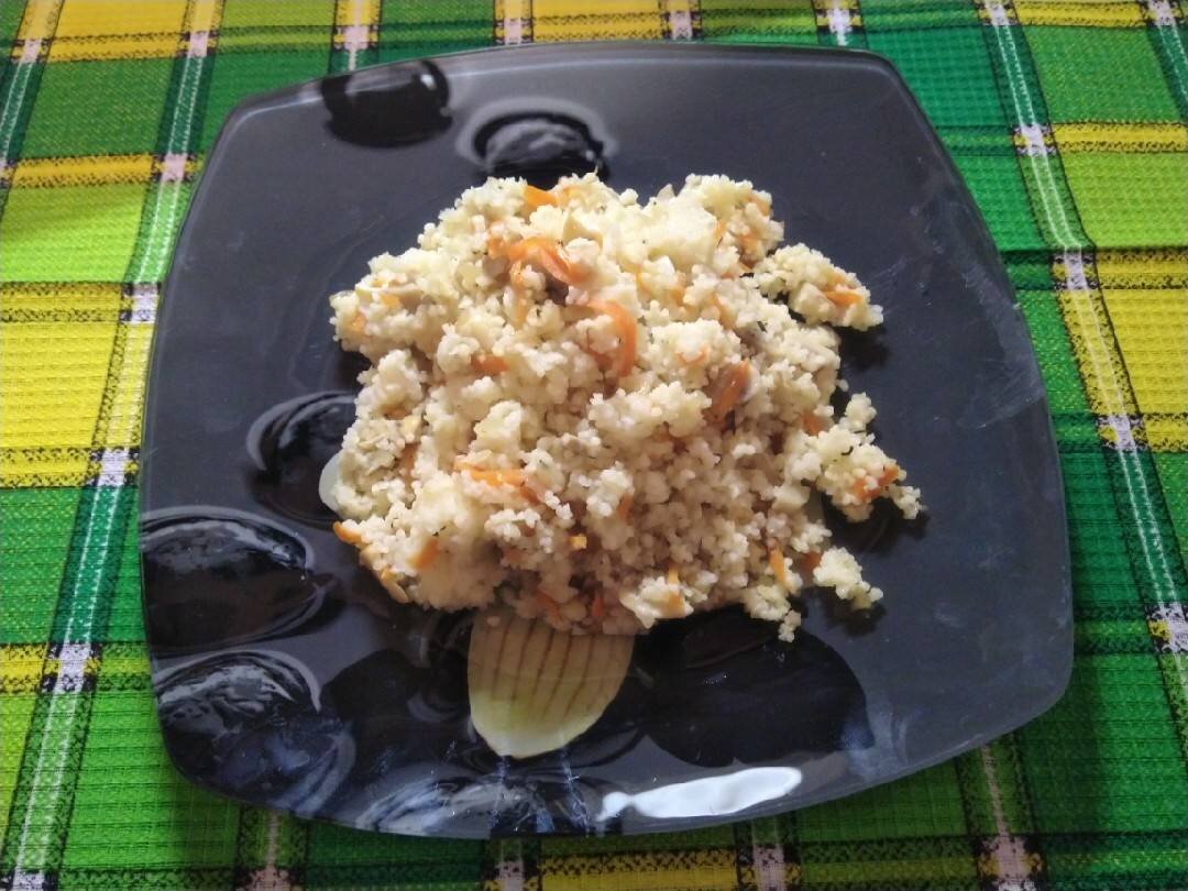 #полезно Ингредиенты: кускуса, шампиньонов, луковица, морковь, тимьяна, сушеного чеснока, растительного масла, Перец, соль Способ приготовления: Лук нарезать мелко, морковь натереть на крупной тёрке. Обжарить на растительном масле. Добавить сушеный чеснок и тимьян. Грибы нарезать пластинами, отправить к овощам, посолить, поперчить и обжарить всё вместе до готовности. Кускус всыпать в кипящую подсоленную воду, поварить 30 секунд, накрыть крышкой и дать настояться, пока жидкость не впитается. (крупа:вода 1:2) Выложить кускус к грибам с овощами, перемешать, прогрев минутку.