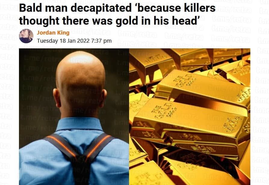 В Мозамбике убили лысого мужчину. Убийцы думали, что у него в голове золото Там существует поверье, что у лысых мужчин внутри черепа есть много золота. И недавно преступники обезглавили местного лысого жителя, чтобы продать его голову. Это уже далеко не первое подобное преступление в Восточной Африке. И золота, конечно, ещё ни разу не находили Классический N момент
