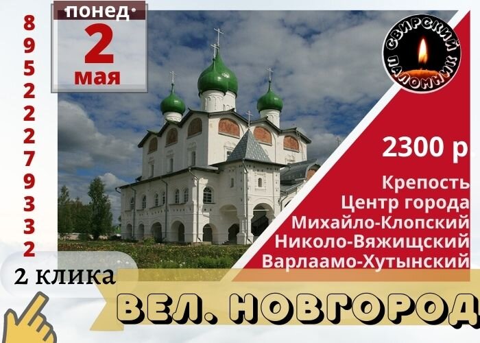 С паломнической службой Свирский паломник вы можете совершить паломнические поездки и экскурсии по святым местам в понедельник 2 мая 2022 года. Экскурсия в Великий Новгород 2.5.22 с посещением: Варлаамо-Хутынского монастыря, Михайло-Клопского монастыря, Николо-Вяжищского монастыря; а так же Центр Великого Новгорода: Крепость, Софийский собор, Тороговая сторона и другие храмы города. Подробнее вы можете познакомиться с описанием программы можно пройти по ссылке >>Великий Новгород - три монастыря>> Бронирование по телефону или через whatsapp +79522279332 Экскурсия в Карелию из Петербурга 2.5.22 с посещением 2-ух монастырей: Важеозерского и Сяндемского. Будет источник и купели в озере. Для омовения в купелях нужны рубахи. Подробнее описание поездки вы сможете посмотреть пройдя по ссылке >>Экскурсия в Карелию - 2 монастыря>> Бронирование поездки в Карелию возможно без предоплат по телефону или через whatsapp по номеру +79522279332 Экскурсия-паломничество в Никандрову пустынь 2.5.22 из П