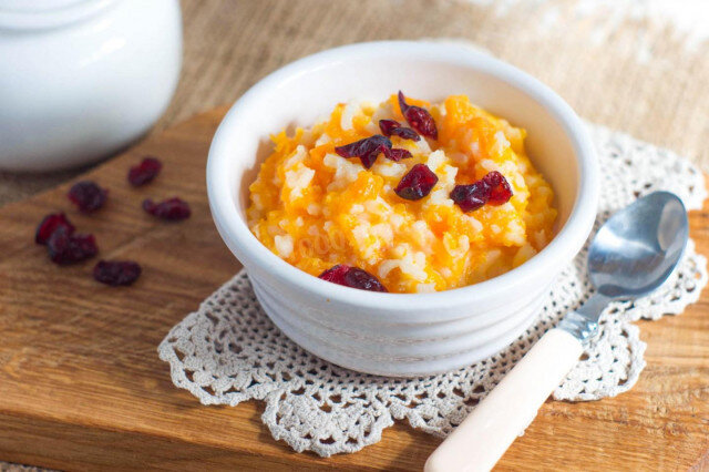 Теперь можете перемешать готовую кашу. Мягкие кусочки тыквы при помощи столовой ложки можно размять в пюре, тогда каша получится яркого однородного цвета, а можно оставить как есть, рис с вкраплением тыквенных ломтиков. При подаче готовую кашу можно сдобрить сливочным маслом, дополнить ароматным медом, сгущенным молоком, сухофруктами (сладким изюмом, вяленой вишней или клюквой), мягкими орехами (грецкие или кешью).