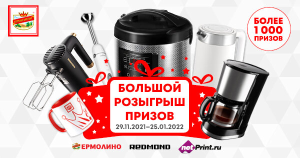 ГАРАНТИРОВАННЫЕ ПОДАРКИ от netPrint и REDMOND! НЕ УПУСТИТЕ ШАНС ВЫИГРАТЬ СУПЕРПРИЗ! Сайт АКЦИИ https://www.ermolino-produkty.ru/prizes_2021/ *Общий срок проведения акции, включая сроки выдачи призов: с 29.11.2021 г. по 25.02.2022 г. включительно.