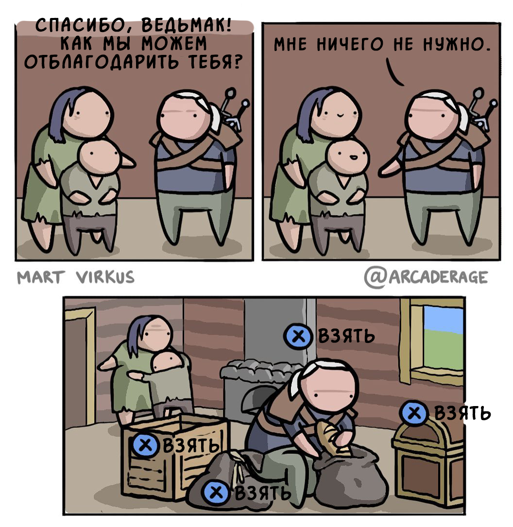 Эстонский художник Март Виркус (Mart Virkus) в рамках своей серии под названием Arcade Rage («Аркадная ярость») постоянно рисует комиксы о популярных видеоиграх. Конечно же, такой хит, как «Ведьмак 3: Дикая Охота», тоже нашел отражение в его творчестве. Март Виркус обратил внимание на одну противоречивую особенность игры, которую, думаю, заметили все, кто знаком с приключениями Геральта из Ривии.