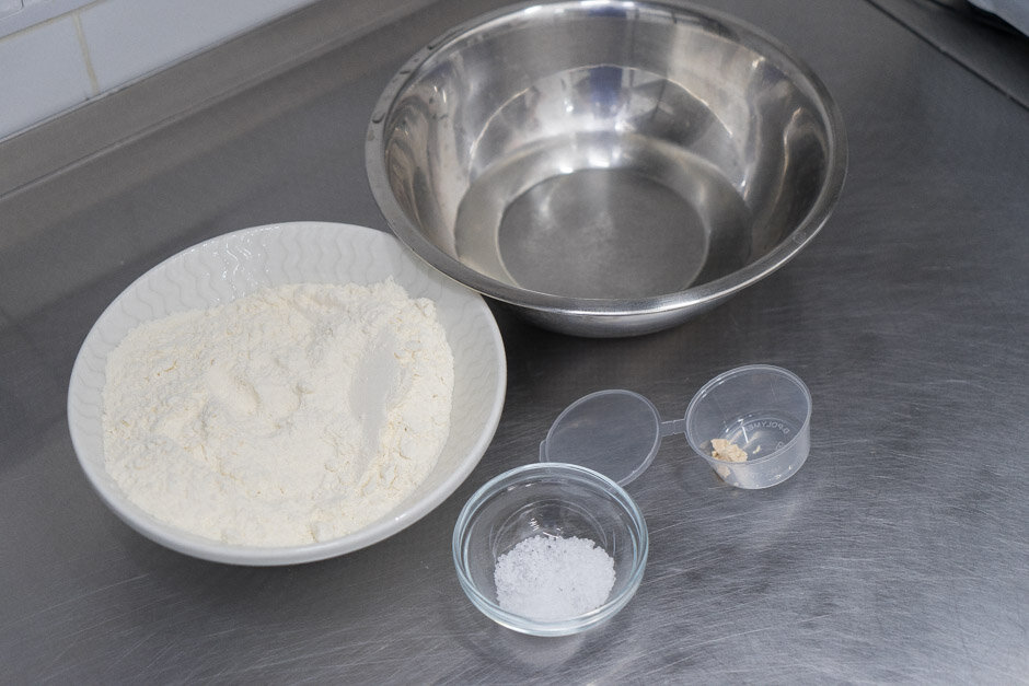 Нет «секретного рецепта», неаполитанская пицца это всего-навсего правильные пропорции муки, воды, соли и дрожжей. Для начала подготовьте все ингредиенты. Живые дрожжи (0,8 г) лучше взвешивать на точных молекулярных весах. Обычно прессованые дрожжи берут в три раза меньше. Но, ребята говорят, что результат сильно отличается не в лучшую сторону. Воду (250 г) можно взвесить и обычными весами. В большой удобной чаше смешайте воду (250 г) и соль (14 г). Дальше добавьте треть муки и снова всё хорошо перемешайте. Возьмите живые дрожжи (0,8 г) в руку, разотрите между ладоней и добавьте в чашу. Хорошо размешайте массу рукой. Постоянно перемешивая тесто, добавьте оставшуюся муку. Главное – правильно вымесить тесто руками, хотя тесто можно вымесить и в миксере (насадка крюк), но на средней скорости. Постепенно тесто начнёт собираться. Вымешивайте тесто до тех пор, пока оно не станет отставать от рук. В идеале у вас должно получиться мягкое и эластичное тесто. Тесто пока не стало гладким. А вот з