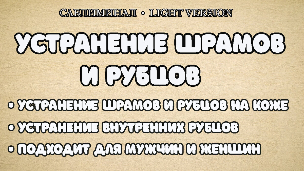 В этот саблиминал входят наилучшим образом подобранные аффирмации (установки) для устранения шрамов и рубцов.