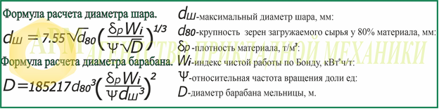 В первом рассчитывается максимальная крупность шаров исходя только из внутреннего диаметра барабана мельницы. Во втором критерий учитывает максимальную крупность зерен материала и так же внутренний диаметр барабана мельницы. Существуют и другие методики расчёта, но все они, включая и описанные ниже не являются догмой и могут рассматривается как начальная стадия подбора крупности шаров.