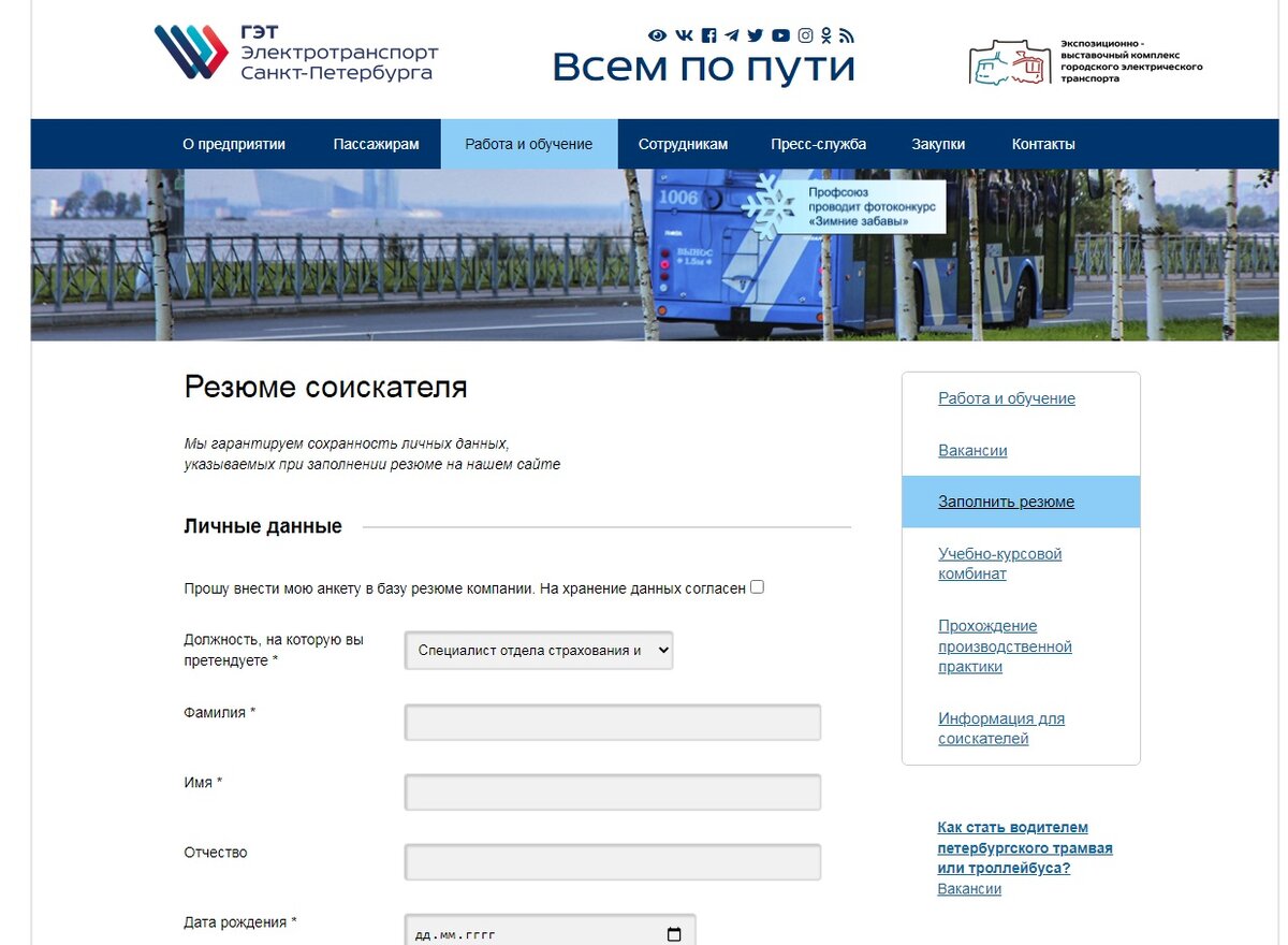 Заполнить резюме на сайте: https://electrotrans.spb.ru/zapolnit_rezume