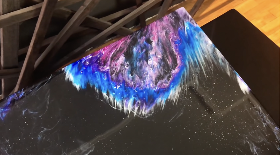 Уберите давление краскопульта на минимум, тогда он будет как бы плеваться краской, а попадая на холст вы будете видеть маленькие “звездочки”. Подготовка к заливке эпоксидной смолы завершена, настало время перейти непосредственно к самой заливке.