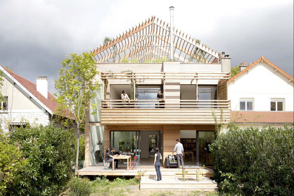 Этот деревянный двухэтажный дом почти классической формы построен в плотном парижском пригороде из «финских» деревянных панелей высокой заводской готовности за две недели. Его изюминкой стала двускатная крыша-беседка. Внешне она выглядит как незавершённая крыша, фактически же это эксплуатируемая плоская кровля с перголой. Такое решение вызвано желанием сохранить архетип контекста, а также максимально использовать площади, которые при обычном решении занимает практически неиспользуемое чердачное помещение. Ещё одно эффектное решение — зеркальные ставни из нержавеющей стали, которые отражают окружающую зелень и добавляют дому визуальной динамики. Внутри дом имеет свободную планировку, для разделения его на зоны используются большие раздвижные панели. Со стороны двора есть большой балкон и терраса, являющаяся продолжением помещений первого этажа. Название: Эко-устойчивый дом (Eco-Sustainable House)