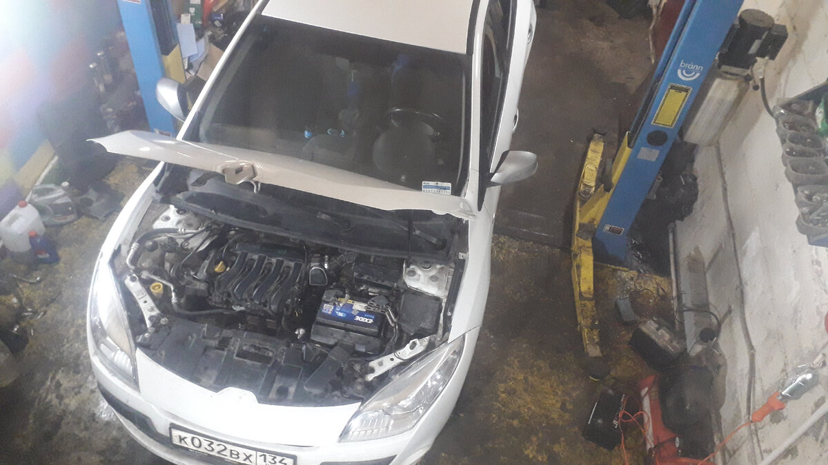Приехал на ремонт Рено Меган 3 1.6 К4М. Двигатель у машины работал как дизель, трещал. Иногда треск прекращался потом снова появлялся. По симптомам все указывало на неисправный фазовращатель. Начинаем разбирать Моторы довольно популярные и устанавливаются на многие автомобили. Снимаем металлический кожух ремня грм. Видим со стороны грм масленые подтеки , течет из под фазовращателя. Используем спец инструмент для снятия фазовращателя и установки грм. Сняли фазовращатель! Новый будем устанавливать фирмы DEFI , кстати это фирма идет и в оригинальной запчасти. Установили новый фазовращатель. Собираем все обратно. Также поменяли клапан фазовращателя. На старом не было сетки. Ну вот и все ремонт окончен! ВСЕМ УДАЧИ НА ДОРОГАХ!