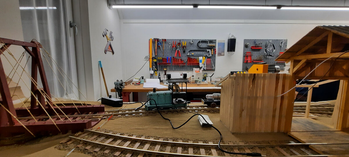 Вот испытательный полигон со строящимися моделями. Слева будет поворотная стрелка. Справа - лесопилка для производства шпал