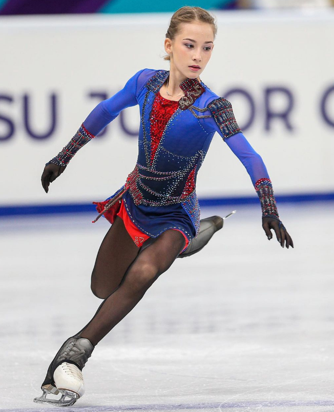 Софья Акатьева стала одной из немногих кто порадовал своим прокатом и у кого получились практически все элементы ультра-си. Тройной аксель пролетный и с очень уверенным докрутом. На четверном тулупе совершенно неожиданно возникли проблемы, ушла ось и пришлось спасать прыжок, с чем Софья справилась. Зато каскад 4+3 сальхов-тулуп дальше был исполнен просто изумительно, сальхов почти на уровне волшебного исполнения Камилы Валиевой.