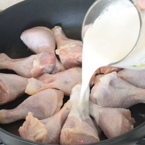 Выкладываем на сухую сковороду куринные ножки у меня антипригарная с толстым дном, заливаем молоком добавляем воду, щепотку соли, перец, накрываем крышкой и томим 20 минут. За 7 минут до готовности добавляем 2 лавровых листочка для аромата. После вык
