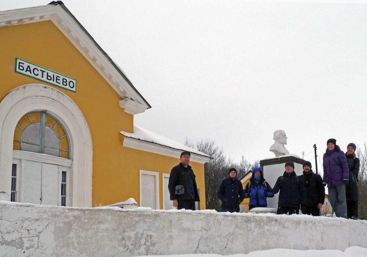 Выходим на станции Бастыево. Она с годами не изменилась. Всё так же пустынно и безлюдно. Вокзал давно закрыт, хотя и поддерживается в приличном виде. И даже не перекрашен как большинство других в известные корпоративные цвета РЖД. Пройти в зал ожидания мы в этот раз не смогли, лишь зайдя в боковую дверь и осмотрев пустые подсобные помещения. У местных жителей выяснили, что вокзалом недавно интересовались, приезжали, что-то фотографировали и замеряли. Коллективное фото у бюста Тургеневу.
